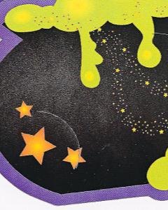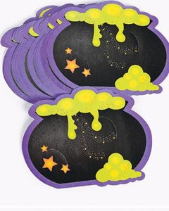 ぶくぶくと泡を立てる魔女の鍋のイラストカード。斜めに切り込みが入っているので、メッセージを挟んでハロウィンパーティーの招待状に、ゲストの名前などを挟んでテーブルに、また壁やドアに貼ってデコレーションにと色々工夫ができそうなカードです。紙製。
