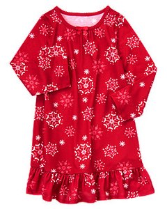 [商品説明] 赤に白い雪の結晶柄がかわいいパジャマガウンです。パジャマの上にすっぽりとかぶって暖を取ってもいいですし、普段着としてセーターの上に着用してもかわいいです。