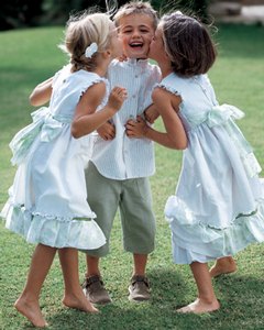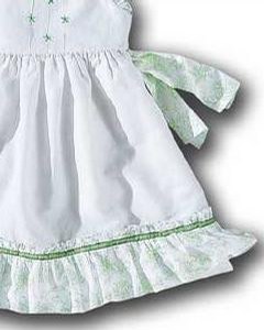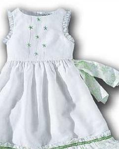 [色・デザイン] 白地に薄いグリーンの小花プリントのフリルがさわやかなサマードレスです。胸元には 3本のタックと小花刺繍が施されています。背中ボタン開閉。袖ぐりはフリル仕上げ、ドレスの裾と同じ素材のリボンを背中で結びます。