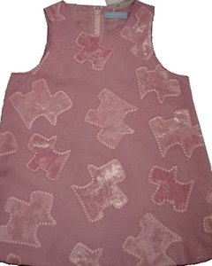 お色は落ち着いたピンク。Aラインのワンピース。 全体に光沢のある別布でテリアのモチーフが入っています。 背中ファスナー開閉。