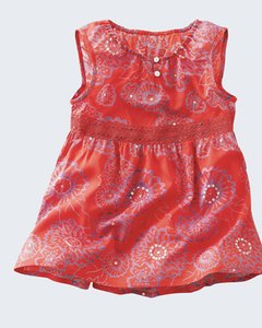[色・デザイン] 赤に紫の花柄。スパンコールのきらきらとハイウエストのレースがお洒落。薄手のふんわりしたコットン地で涼しいトップです。