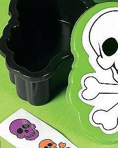 ガイコツシールが付いたケースに、メモ用紙、クレヨン、シールが入っています。