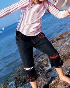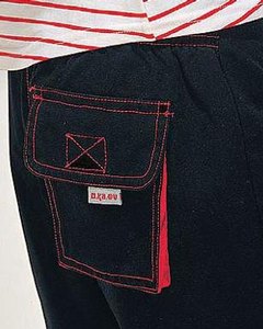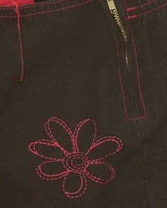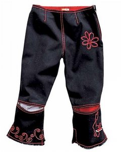 [色・デザイン] お色は黒に近い濃紺。七部丈、赤のラインステッチとステッチ刺繍がコントラストに入っています。左ファスナー開閉、ウエストバックゴム入り。バックにポケットが 1つ付いています。膝下の切り込み風のアクセントと裾の 5cmスリットがお洒落です。