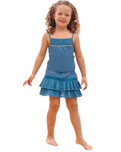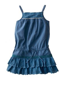 [色・デザイン] お色はダークブルー。ショート丈のワンピースです。ショルダーストラップは長さ調節可能。胸元のレースとスパンコール刺繍がお洒落です。裾のフリルもレースになります。スパッツやレギンスが似合います。