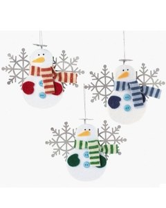 [デザイン] 厚みのあるフエルト地のスノーマンに雪の結晶型のメタルが羽として付いています。
