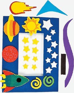 宇宙をテーマにした写真立てを作成するキットです。完成したフレームの裏面にご家庭の写真を貼り付けるシンプルなデザインになっています。最後にお写真より一回り大きくカット した色画用紙を写真の裏に貼ると良いでしょう。