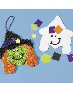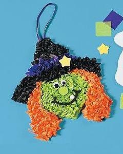 台紙にカットされた花紙を小さく丸めて貼り付けて作る魔女の壁飾りキットです。台紙はシール状なのでボンド不要ですが、粘着力が弱い場合は市販の木工用ボンドをご利用ください。