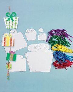 大中小 6枚のプレゼント型にご家庭のマーカーやクレヨン、モール、ボタン、折り紙、ラメなどでご自由にデコレーションをして、キットのリボンでつなげて飾るクラフトです。モビールのようにつなげて飾っても素敵ですし、一個ずつ壁やツリーに掛けても素敵です。
