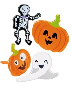 [商品説明] 2種類の jack-o'-lanterns とガイコツ、ゴーストの 4種類。表面はマットな感じで、パンプキンの色は画像よりも朱色に近いです。