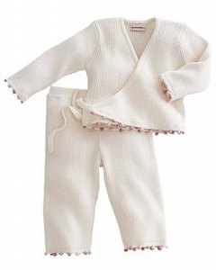 [色・デザイン] お色はオフホワイト。カシュクールスタイルのトップとボトムズのかわいい上下セットとなります。トップの紐は後で結びます。ボトムズはウエスト総ゴム。上下共に裾に 2色の糸で編んだポンポンが付いていて、とってもお洒落なデザインです。