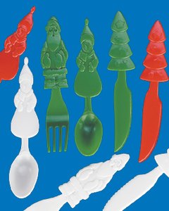 赤、白、緑のクリスマスカラーのナイフ、フォーク、スプーンのセットです。長さ = 15cm。 6本ずつ、計18本のお届けになります。