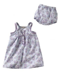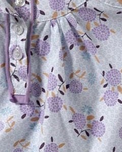 [色・デザイン] 白地に薄紫と水色の花模様。フロントボタン開閉。肩から脇、フロントに切りっぱなしのボーダーが入っています。