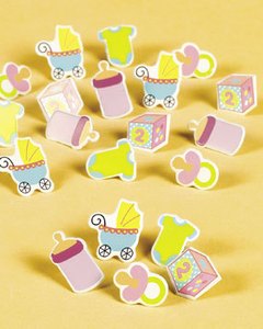 哺乳瓶、ベビーカー、おしゃぶり、おもちゃ、足跡、肌着を形どったブラッズ 6個セットです。