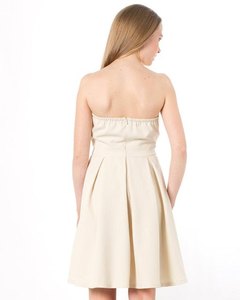 [色・デザイン] お色は明るいシャンペンベイジュ。ビスチェタイプのフォーマルワンピースです。背中コンシールファスナー開閉。Vネックの胸元とハイウエストラインの上に施されたヨークプリーツがお洒落。内部のビスチェはゴムが入っていて、ズレ落ちを防いでくれます。結婚式のお呼ばれや、パーティー、発表会などにどうぞ。