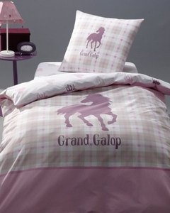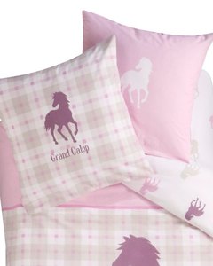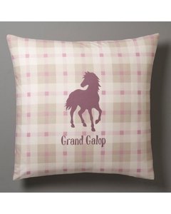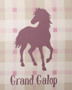 [デザイン] 片面はチェック柄に紫の馬のシルエットプリント、もう片面はピンク地(無地)に白の馬のシルエット。エンベロップタイプでファスナー開閉ではありません。