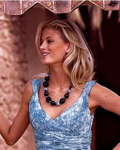 [デザイン] ガラスビーズやクロッシェボール、リボン巻きボール、カラー木玉など紺とシルバーを貴重にしたビーズネックレス。長さ 約 50cm