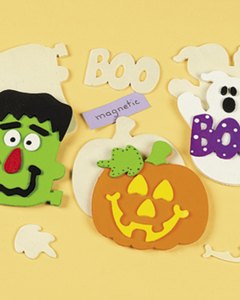 フランケンシュタイン、ジャコランタン、ゴーストのマグネットキット。白木の状態ですので、ご家庭のマーカーやアクリル絵の具などで色を付けてください。