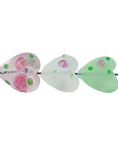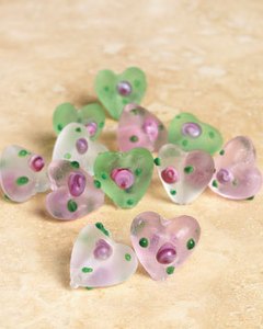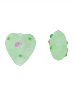 曇りガラス調のハート形のビーズ。中央にバラの花が付いています。