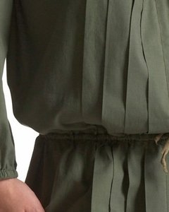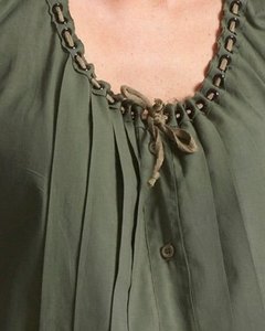 [色・デザイン] お色は深緑。広い襟ぐりはコードで調節できます。 フロントボタン開閉。襟とローウエストは切りっぱなし加工。 袖口はゴムが入っています。