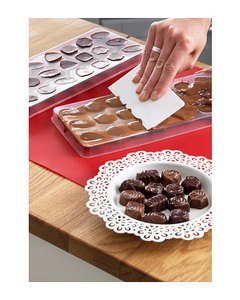 [商品説明] チョコレート型(24cm x 11cm)3個とスクレーパー(12cm x 6cm)1個のセット。1個の型で27粒のチョコレートが取れます。食器洗い乾燥機対応。バレンタインの手作りチョコレートにどうぞ。