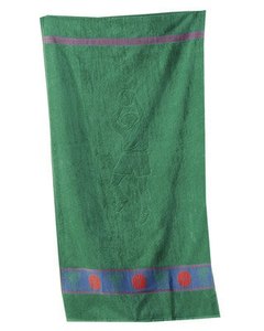 [色・デザイン] お色はグリーン。両端のブルーとオレンジのボーダーがアクセント。画像では見えにくいのですが、ジャガード織り込みで大きなバスケット選手が描かれています。