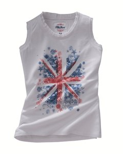 [色・デザイン] 白地にユニオンジャックプリントとPEPE JEANSの文字が入ったタンクトップ。お花と星柄で表現されたユニオンジャック、フリルが付いたネックラインと袖ぐりがガーリー。