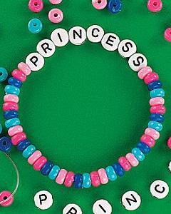 PRINCESS の 8文字が入ったビーズと 2種類のピンクとブルーのプラスチックビーズで作るブレスレットのキットです。