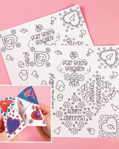 折り紙の「ぱくぱく(ぱっくんちょ)」で占いを楽しむシートです。お子様が自由に色塗りを楽しんだ後は折り紙をして画像左下の占いゲームを仕上げます。