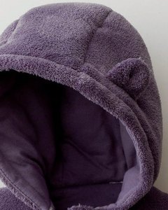 [色・デザイン] お色は少しグレーがかった紫でとても落ち着いた色です。クマさんの耳が付いたフードがかわいいジャケット。フロントにクマとウサギのアップリケ刺繍入り。袖口にはハンドカバーが付いています。ベビーカーでのお出かけにぴったりのジャケットです。