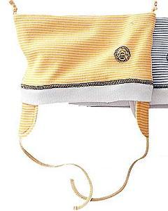 [色・デザイン] イエローと白のボーダー。耳宛付きでお子様のあごの下で結ぶボンネットタイプです。フランスブランド シュークル ドルジェの商品です。
