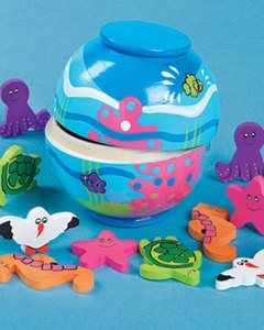 水族館をモチーフにした容器の中に色とりどりの魚が 10ピース入っています。容器、魚のピースとも木製で、手描きのデザインです。
