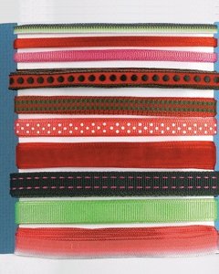 クリスマスがテーマのリボンが 10種類入ったセットです。裏面はテープになっています。リボン幅は 6mm - 2cm、長さ 180cmになります。ボーダー、ブックマーク、エンベリッシュメントなどカードアートやスクラップブッキングに大変便利です。