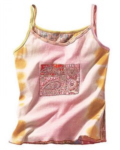 [色・デザイン] オレンジ&ピンクが基調のタイダイの Tシャツ地。フロントにパッチワーク調のサテン地のビーズ刺繍がゴージャスに入っています。重ね着してもかわいいです。