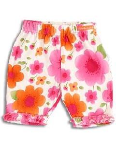 [色・デザイン] 白地に大中小のピンクとオレンジのお花のプリント。ウエスト総ゴム、裾にはフリルが付いています。