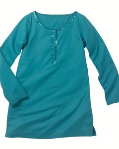 お色はターコイズ。クルタスタイルのカットソー。 フロント、ボタン4個開閉、ネックラインと胸元にスパンコール刺繍。