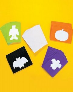 ハロウィンにちなんだ形が型抜きされた 4色のカードと白の封筒のセットです。 1セットに 4枚のカードが入っています。