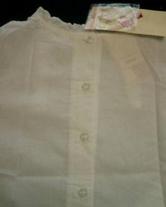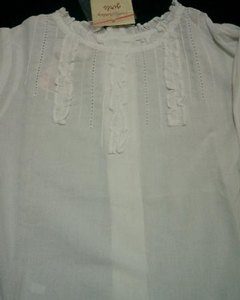 [色・デザイン] お色は白。柔らかい薄手のボイル地で風通しのよい素材です。バックボタン開閉。襟、裾、フロントにフリル付き。フロントのフリル 3本の脇にはレ-ス編みのような小さな穴や細いプリーツが施されていてフェミニンで清涼感があります。