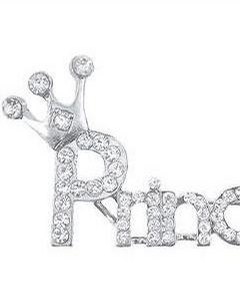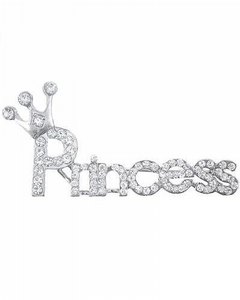 [デザイン] 全体がシルバー調で、 Princess の英文字にティアラ (冠) がちょこんとのっています。文字、ティアラにスワロフスキーのクリスタル (ラインストーン) が付いていて、大変美しい輝きを見せてくれます。コートやジャケットの襟元、布バッグのアクセントにどうぞ。