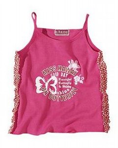 [色・デザイン] お色は濃いピンク。フロントに MISS HAWAII ON BUTTERFLY のメッセージとお花や蝶のプリント入り。両脇に赤と白のギンガムチェックの布がシャーリング加工で付いています。