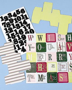 キットのボックスシート 25個を組立てて、We WISH YOU A Very MERRY CHRISTMAS の文字と 1 - 25の数字シールを貼って仕上げる立体的なカレンダーです。 12月 1日から1つずつ箱を飾っていってもいいですし、重ねて置いて毎日日付から模様に、模様から日付にひっくり返していっても面白いです。